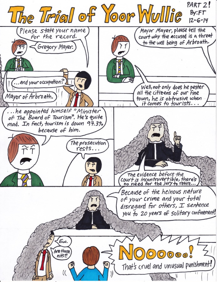 ‘What!…Dad, some people with posh English accents turned up and they’ve taken YoorWullie to………..Edinbro Castle!!!…..what if they find out what he REALLY thinks, god knows what they’ll do to him…… Well maybe he doesn’t know, but I can think of a few things they might…we have to go rescue him!’
