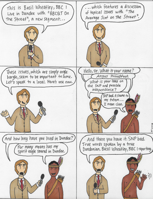 I made this comic after reading this blog post by Wings Over Scotland about the bias and clear manipulation by the BBC during its BBCQT in Dundee. And before anyone gets upset or offended that I am using tired stereotypes, it was not my intention to demean anyone. I used a Native American simply because that is about as Dundonian as the people on the show. Itβs a form of hyperbole. FT π