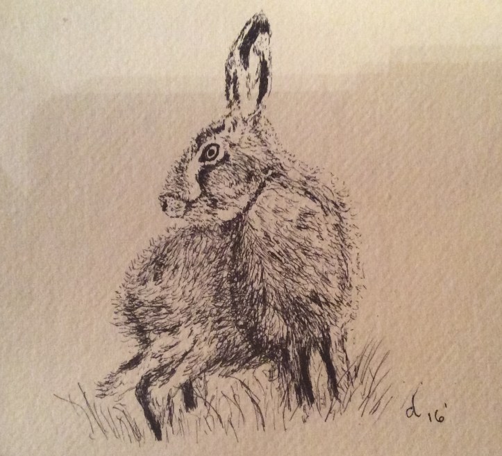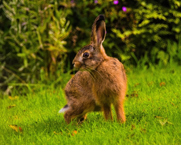 One night during late Summer I was called to the window to see a young hare in our garden. With the sunset glowing in the background, our young visitor looked beautiful. I quickly grabbed my camera before it disappeared………….