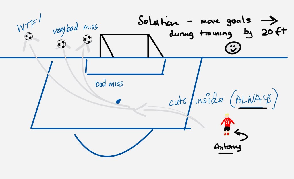 We know he’s had his off field problems this season but even before that Antony has struggled to match his expensive transfer fee. He can take a ball out of the sky better than most players I’ve ever seen but he almost always plays the ball backwards. He doesn’t appear to want to use his right foot and, as a result, almost never takes on a defender on the outside. So, he always cuts in on his left. Defenders know he’ll do this so he’s normally cut off or blocked. If he does create a yard of space then he’ll almost always hit it wide left of the goal, I have a solution………….