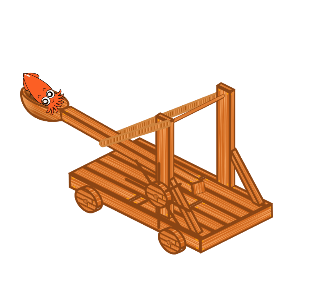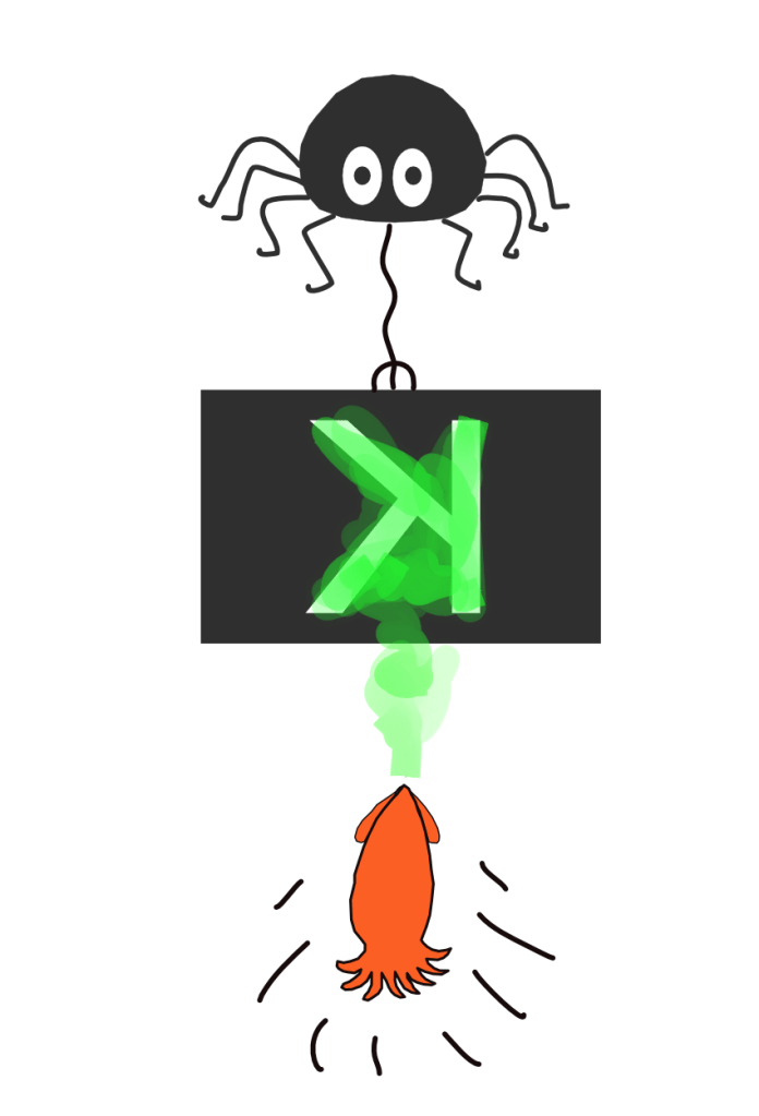 As soon as the catapult is activated, a spider dangles from it’s web with a stencil of the letter or number required. The Squid shoots the required colour of ink through the stencil onto the screen. In the example shown a green K is required thus the spider has dangled the letter K and the squid has ejected green ink as required.