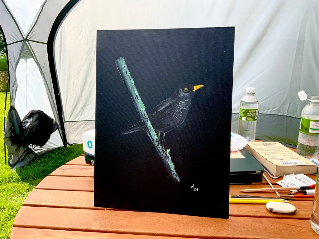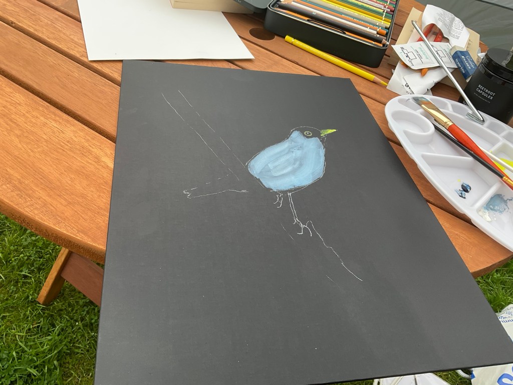 Then yesterday I attempted a gouache blackbird on a black canvas I’d bought last week.