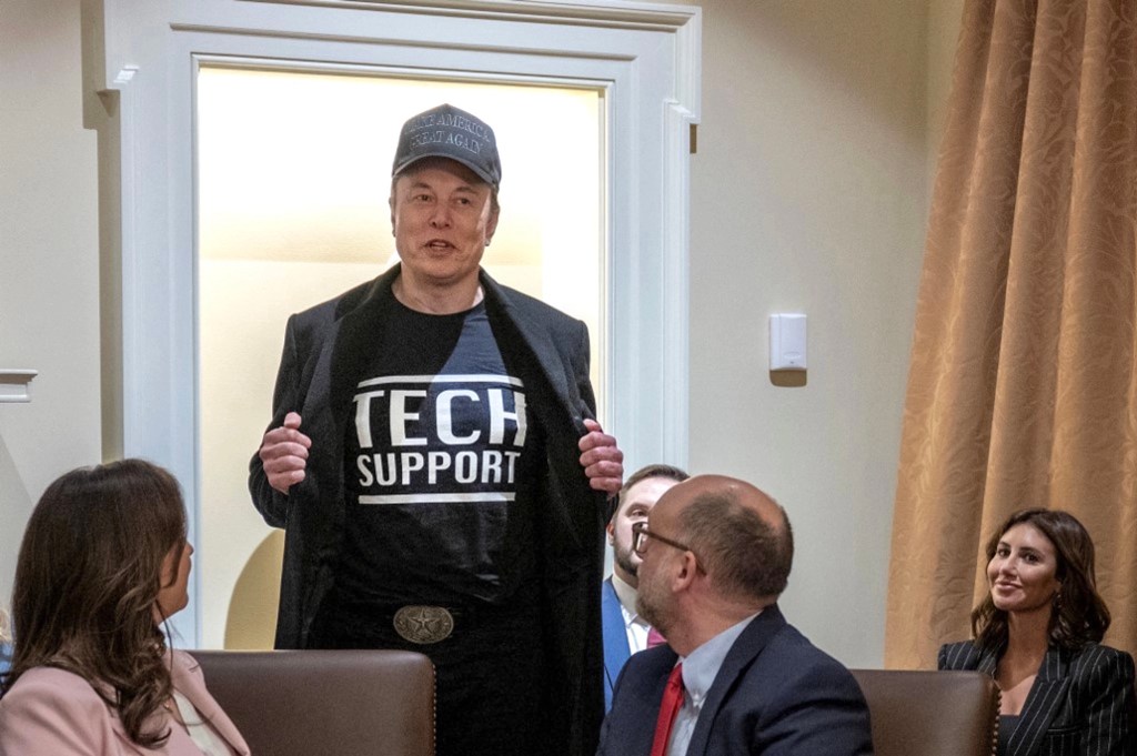 As if ICE wasn’t bad enough, Trump created DOGE. The Department of Government Efficiency. He even appointed the brightest man in the room, Elon Musk, to run it. He waded in with a possee of young bright starlet geniuses who the bold Musk said would save $2 trilllion in federal spending. Trump even started inviting Elon, despite him not being officially a vetted government member, to cabinet meetings. Musk would reveal his t-shirts with ‘TECH SUPPORT’ , ‘OCCUPY MARS’ or the cringing ‘DOGEFATHER’. It would turn out to be much easier to get him to reveal his T-shirts than it was to get him to reveal actual savings.